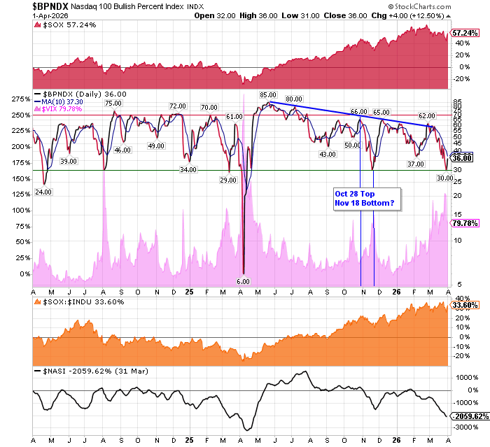 After the market closes updated data on the NASDAQ 100 and Point and Figure Data for the NDX. Also Point and Figure Data on the 30 SOX Components. An explanation of PnF Charting can be found here: