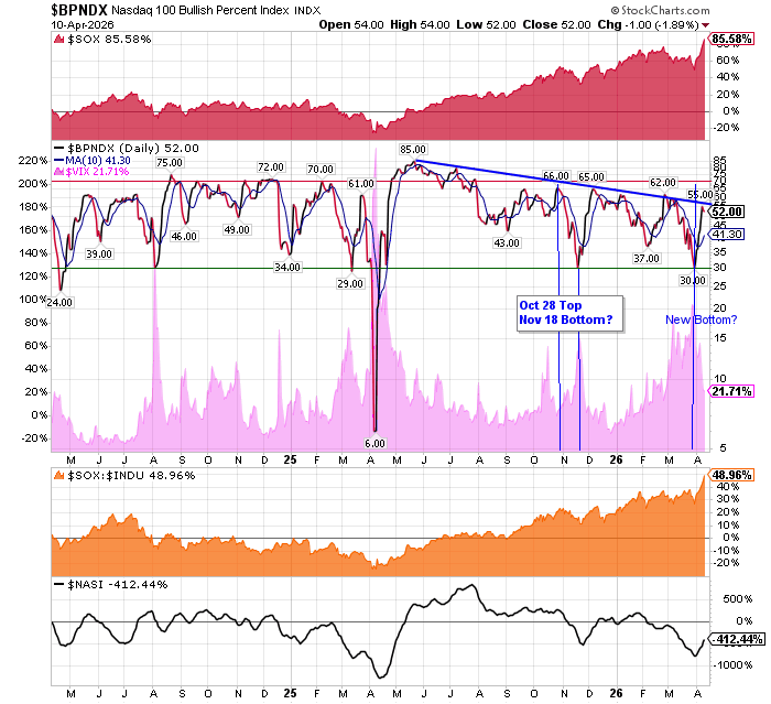 After the market closes updated data on the NASDAQ 100 and Point and Figure Data for the NDX. Also Point and Figure Data on the 30 SOX Components. An explanation of PnF Charting can be found here: