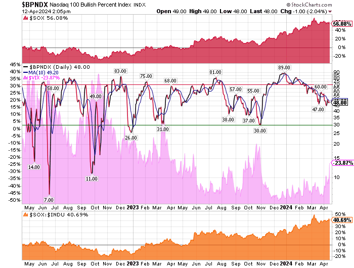 After the market closes updated data on the NASDAQ 100 and Point and Figure Data for the NDX. Also Point and Figure Data on the 30 SOX Components. An explanation of PnF Charting can be found here: