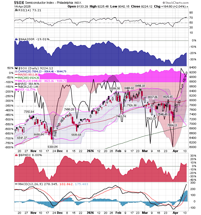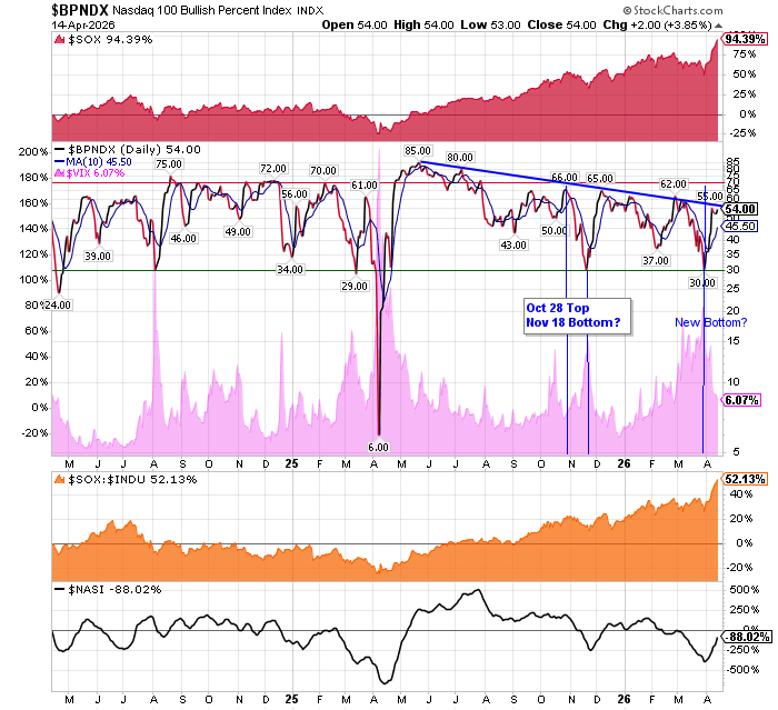 After the market closes updated data on the NASDAQ 100 and Point and Figure Data for the NDX. Also Point and Figure Data on the 30 SOX Components. An explanation of PnF Charting can be found here: