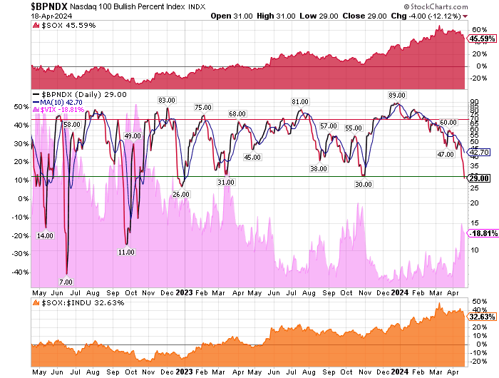 After the market closes updated data on the NASDAQ 100 and Point and Figure Data for the NDX. Also Point and Figure Data on the 30 SOX Components. An explanation of PnF Charting can be found here:
