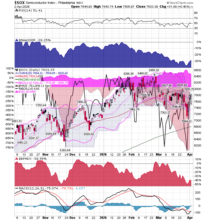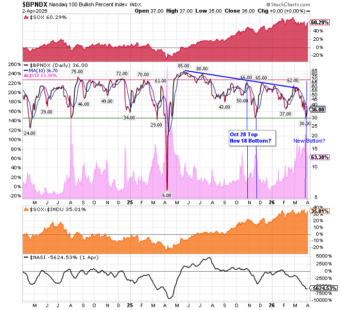 After the market closes updated data on the NASDAQ 100 and Point and Figure Data for the NDX. Also Point and Figure Data on the 30 SOX Components. An explanation of PnF Charting can be found here: