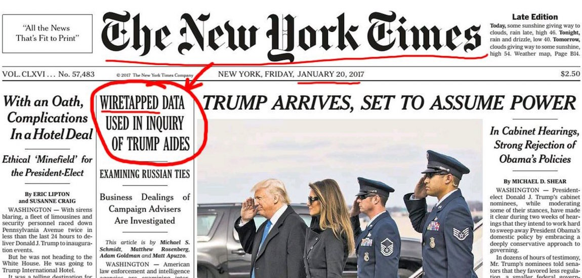 SAME NY Times Reporter Said Trump Team Was Wiretapped In Jan., But Said TRUMP Lacked Evidence In March "The F.B.I. is leading the investigations, aided by the National Security Agency, the C.I.A. and the Treasury Department’s financial crimes unit. The investigators have accelerated their efforts in recent weeks but have found no conclusive evidence of wrongdoing, the officials said. One official said intelligence reports based on some of the wiretapped communications had been provided to the White House." by Jeff Dunetz | Mar 6, 2017