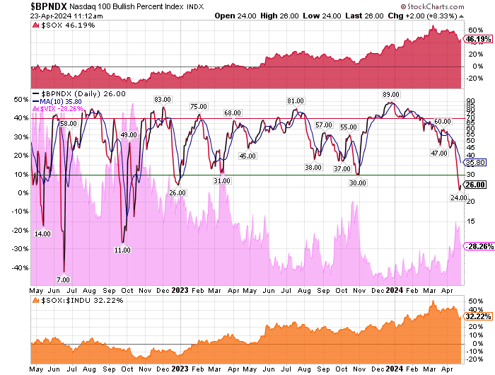 April 23, 2024 The market has been over sold. BPNDX reading of 24 and a BPSOX of only 1 has led me to buy the SMH for an oversold bounce.