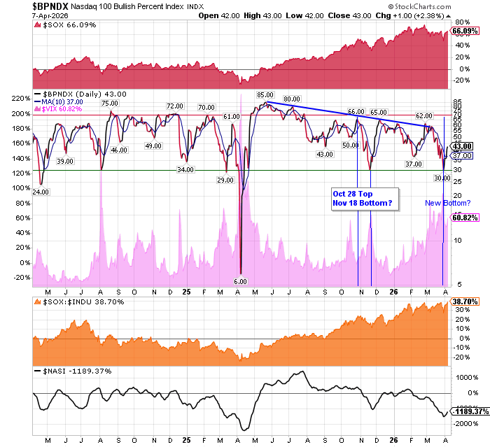 After the market closes updated data on the NASDAQ 100 and Point and Figure Data for the NDX. Also Point and Figure Data on the 30 SOX Components. An explanation of PnF Charting can be found here: