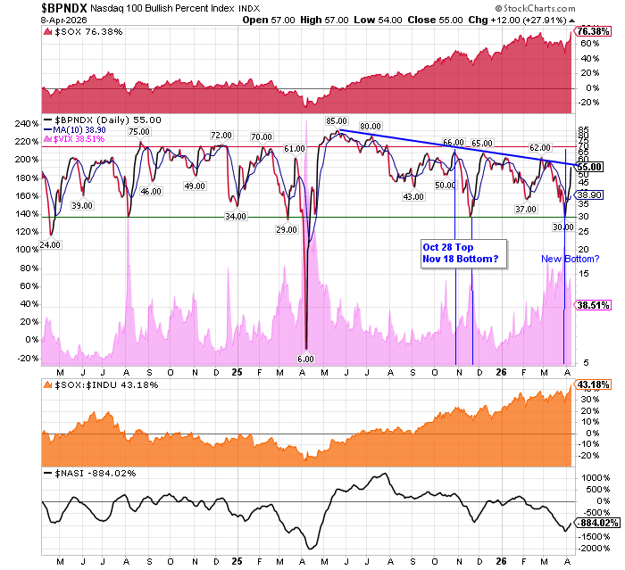 After the market closes updated data on the NASDAQ 100 and Point and Figure Data for the NDX. Also Point and Figure Data on the 30 SOX Components. An explanation of PnF Charting can be found here: