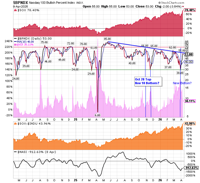 After the market closes updated data on the NASDAQ 100 and Point and Figure Data for the NDX. Also Point and Figure Data on the 30 SOX Components. An explanation of PnF Charting can be found here: