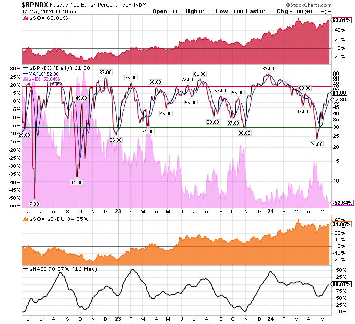 After the market closes updated data on the NASDAQ 100 and Point and Figure Data for the NDX. Also Point and Figure Data on the 30 SOX Components. An explanation of PnF Charting can be found here: