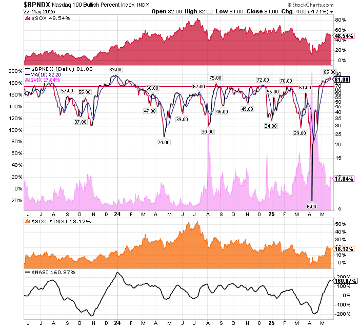 After the market closes updated data on the NASDAQ 100 and Point and Figure Data for the NDX. Also Point and Figure Data on the 30 SOX Components. An explanation of PnF Charting can be found here: