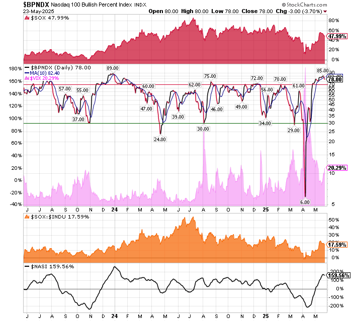 After the market closes updated data on the NASDAQ 100 and Point and Figure Data for the NDX. Also Point and Figure Data on the 30 SOX Components. An explanation of PnF Charting can be found here: