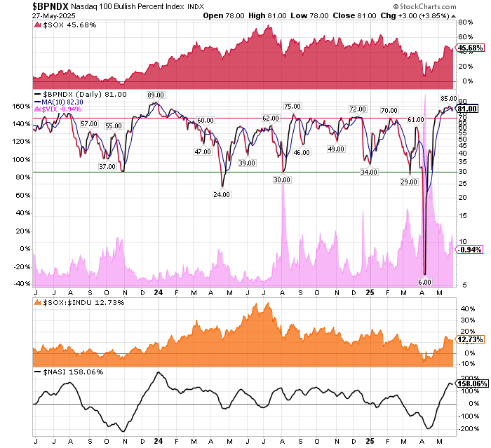After the market closes updated data on the NASDAQ 100 and Point and Figure Data for the NDX. Also Point and Figure Data on the 30 SOX Components. An explanation of PnF Charting can be found here: