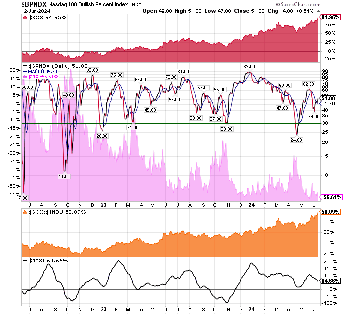 After the market closes updated data on the NASDAQ 100 and Point and Figure Data for the NDX. Also Point and Figure Data on the 30 SOX Components. An explanation of PnF Charting can be found here: