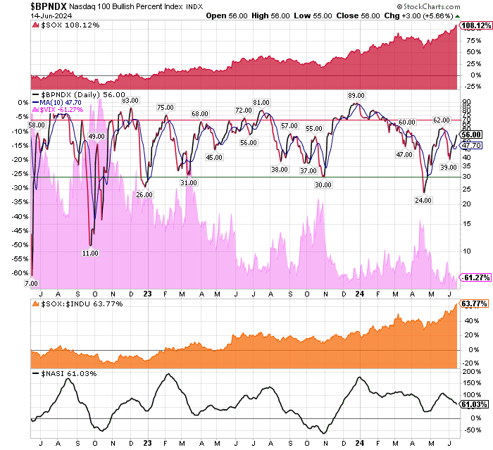 After the market closes updated data on the NASDAQ 100 and Point and Figure Data for the NDX. Also Point and Figure Data on the 30 SOX Components. An explanation of PnF Charting can be found here: