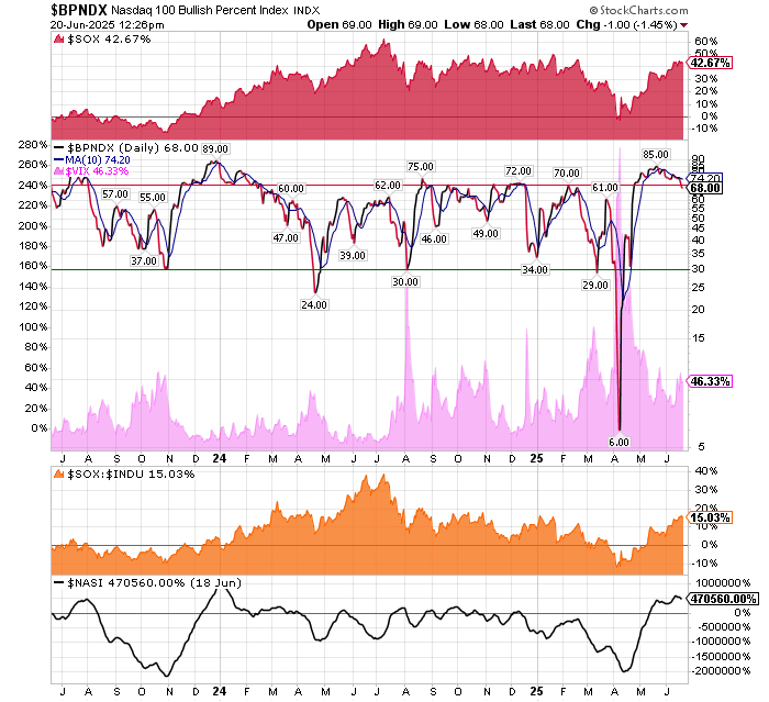 After the market closes updated data on the NASDAQ 100 and Point and Figure Data for the NDX. Also Point and Figure Data on the 30 SOX Components. An explanation of PnF Charting can be found here:
