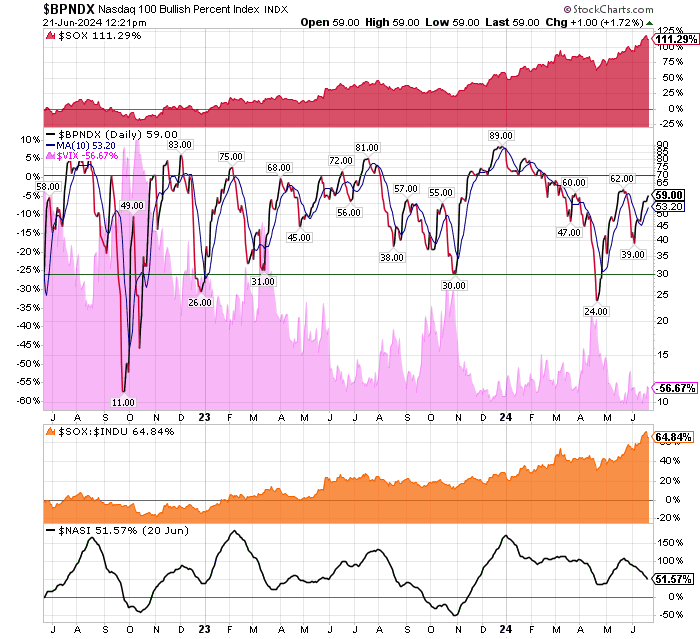 After the market closes updated data on the NASDAQ 100 and Point and Figure Data for the NDX. Also Point and Figure Data on the 30 SOX Components. An explanation of PnF Charting can be found here: