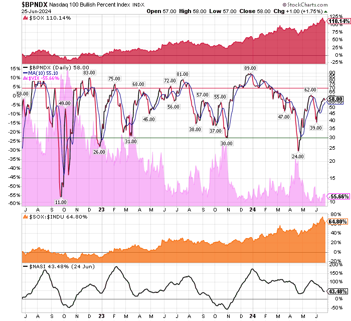 After the market closes updated data on the NASDAQ 100 and Point and Figure Data for the NDX. Also Point and Figure Data on the 30 SOX Components. An explanation of PnF Charting can be found here: