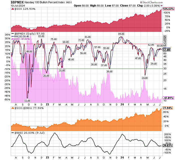 After the market closes updated data on the NASDAQ 100 and Point and Figure Data for the NDX. Also Point and Figure Data on the 30 SOX Components. An explanation of PnF Charting can be found here: