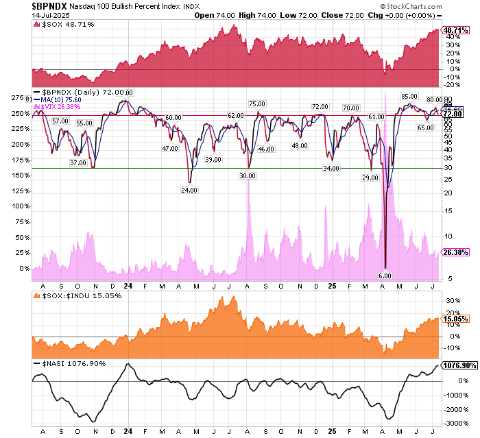 After the market closes updated data on the NASDAQ 100 and Point and Figure Data for the NDX. Also Point and Figure Data on the 30 SOX Components. An explanation of PnF Charting can be found here: