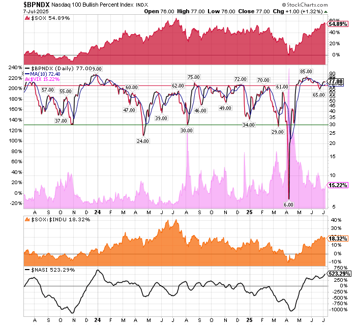 After the market closes updated data on the NASDAQ 100 and Point and Figure Data for the NDX. Also Point and Figure Data on the 30 SOX Components. An explanation of PnF Charting can be found here: