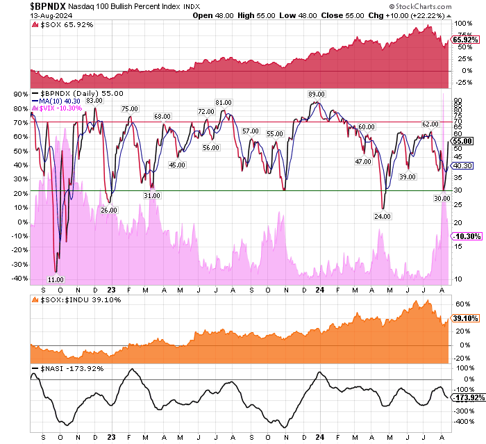 After the market closes updated data on the NASDAQ 100 and Point and Figure Data for the NDX. Also Point and Figure Data on the 30 SOX Components. An explanation of PnF Charting can be found here: