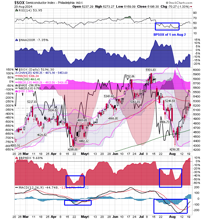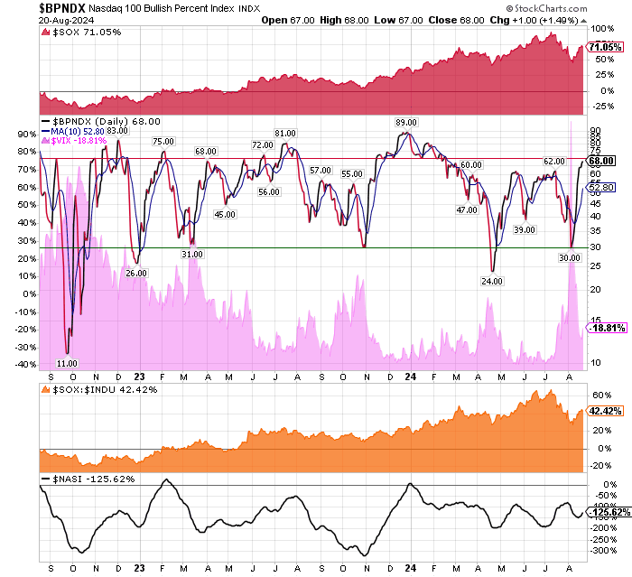 After the market closes updated data on the NASDAQ 100 and Point and Figure Data for the NDX. Also Point and Figure Data on the 30 SOX Components. An explanation of PnF Charting can be found here: