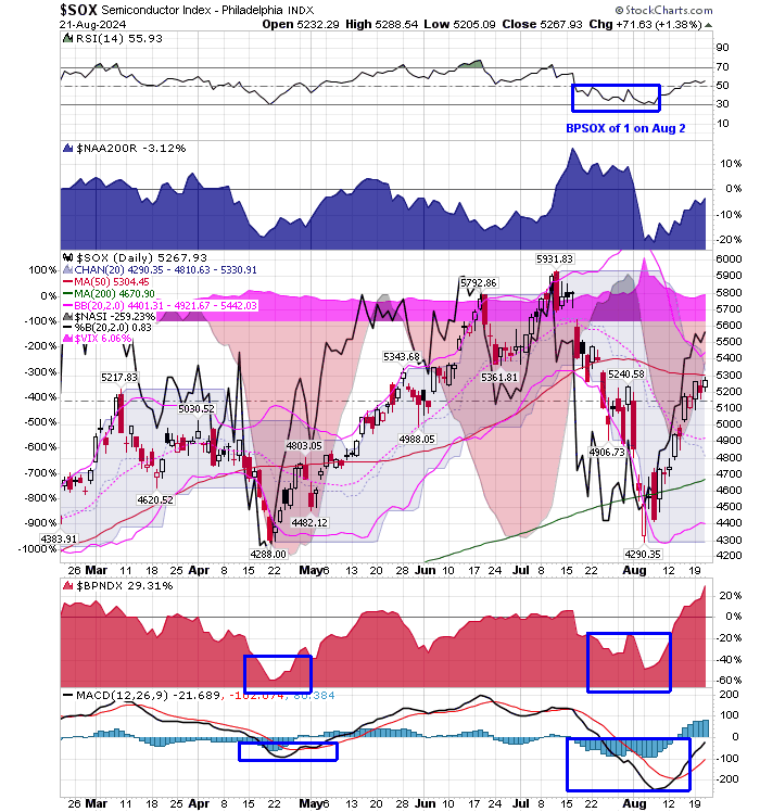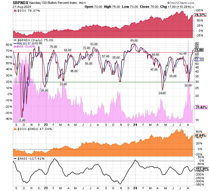After the market closes updated data on the NASDAQ 100 and Point and Figure Data for the NDX. Also Point and Figure Data on the 30 SOX Components. An explanation of PnF Charting can be found here: