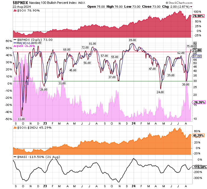 After the market closes updated data on the NASDAQ 100 and Point and Figure Data for the NDX. Also Point and Figure Data on the 30 SOX Components. An explanation of PnF Charting can be found here: