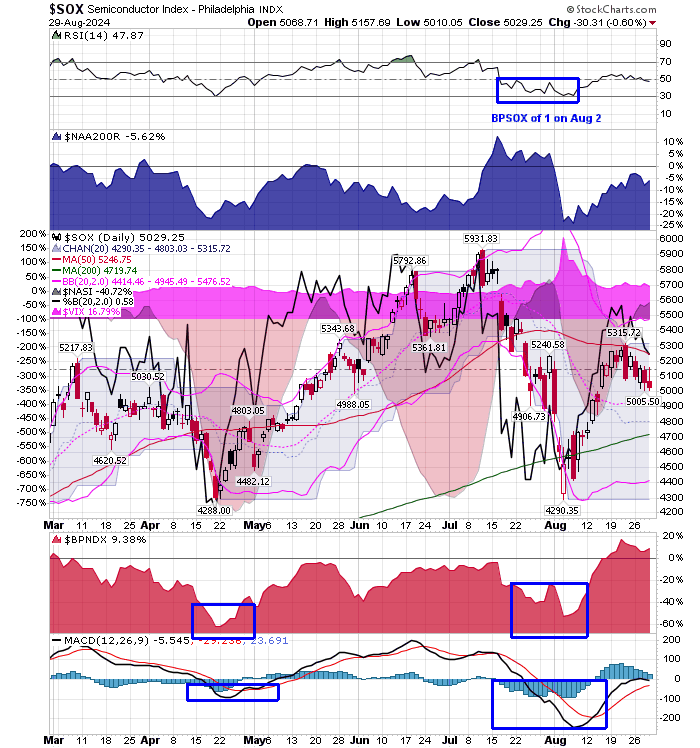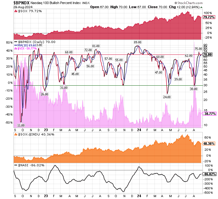 After the market closes updated data on the NASDAQ 100 and Point and Figure Data for the NDX. Also Point and Figure Data on the 30 SOX Components. An explanation of PnF Charting can be found here: