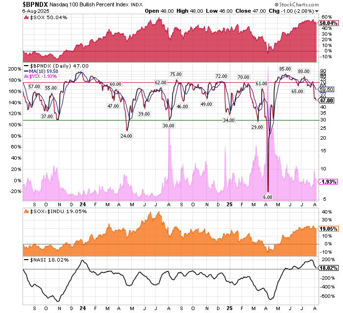 After the market closes updated data on the NASDAQ 100 and Point and Figure Data for the NDX. Also Point and Figure Data on the 30 SOX Components. An explanation of PnF Charting can be found here:
