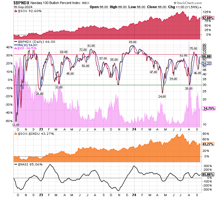After the market closes updated data on the NASDAQ 100 and Point and Figure Data for the NDX. Also Point and Figure Data on the 30 SOX Components. An explanation of PnF Charting can be found here: