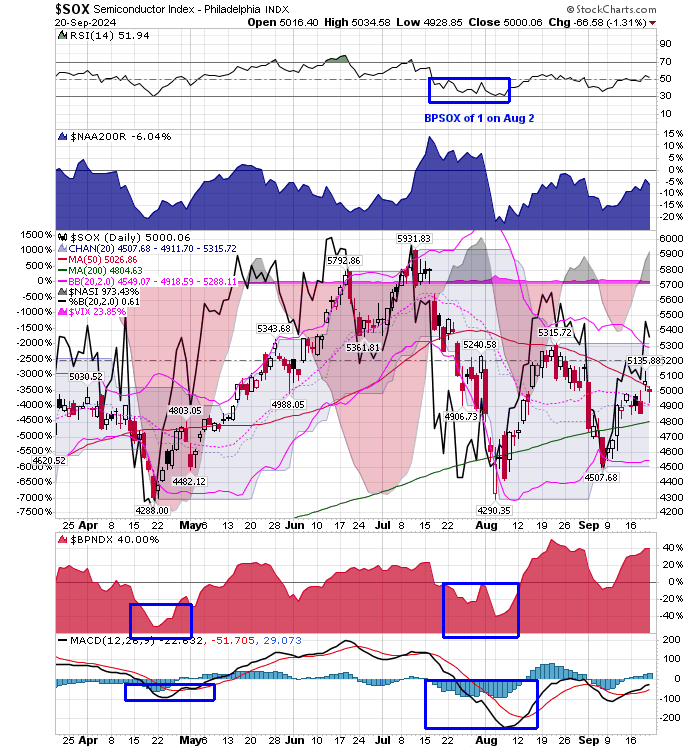 After the market closes updated data on the NASDAQ 100 and Point and Figure Data for the NDX. Also Point and Figure Data on the 30 SOX Components. An explanation of PnF Charting can be found here: