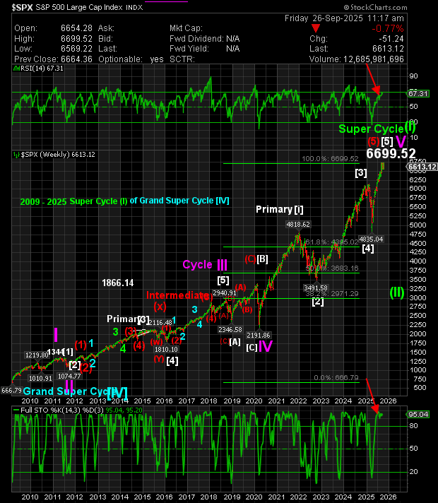 Emphases will be on short-term to long-term Index trends. The S&P 500 indicates that we are very late in Super Cycle (I) of Grand Super Cycle [V]. Once Super Cycle (I) is complete, we will have a market correction of more than 50%. Hope for the country and the economy has spurred optimism, resulting in market strength that has pushed the top of SC (I) to ever newer heights. The expectation now is for it to continue to at least the 6700 area. 9/11/2025