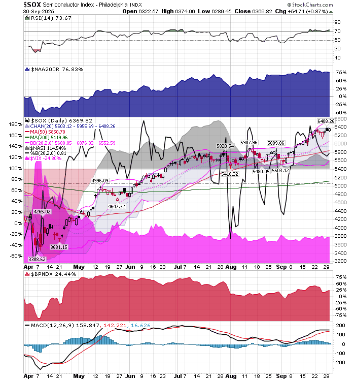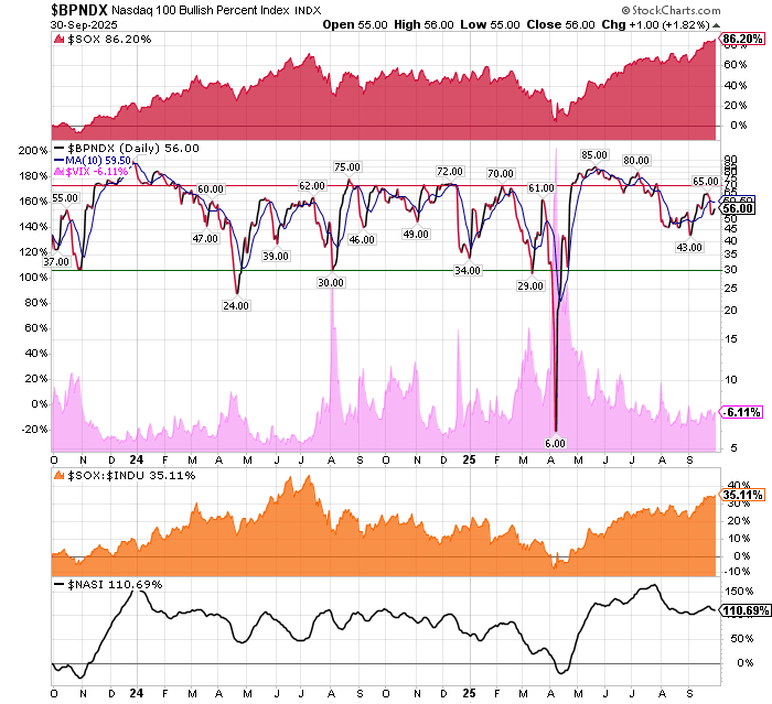 After the market closes updated data on the NASDAQ 100 and Point and Figure Data for the NDX. Also Point and Figure Data on the 30 SOX Components. An explanation of PnF Charting can be found here: