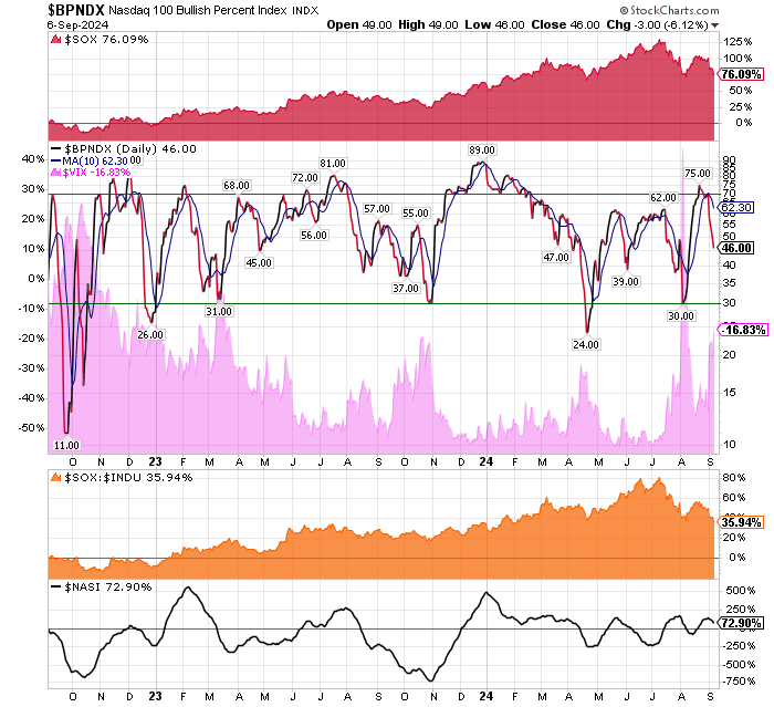 After the market closes updated data on the NASDAQ 100 and Point and Figure Data for the NDX. Also Point and Figure Data on the 30 SOX Components. An explanation of PnF Charting can be found here: